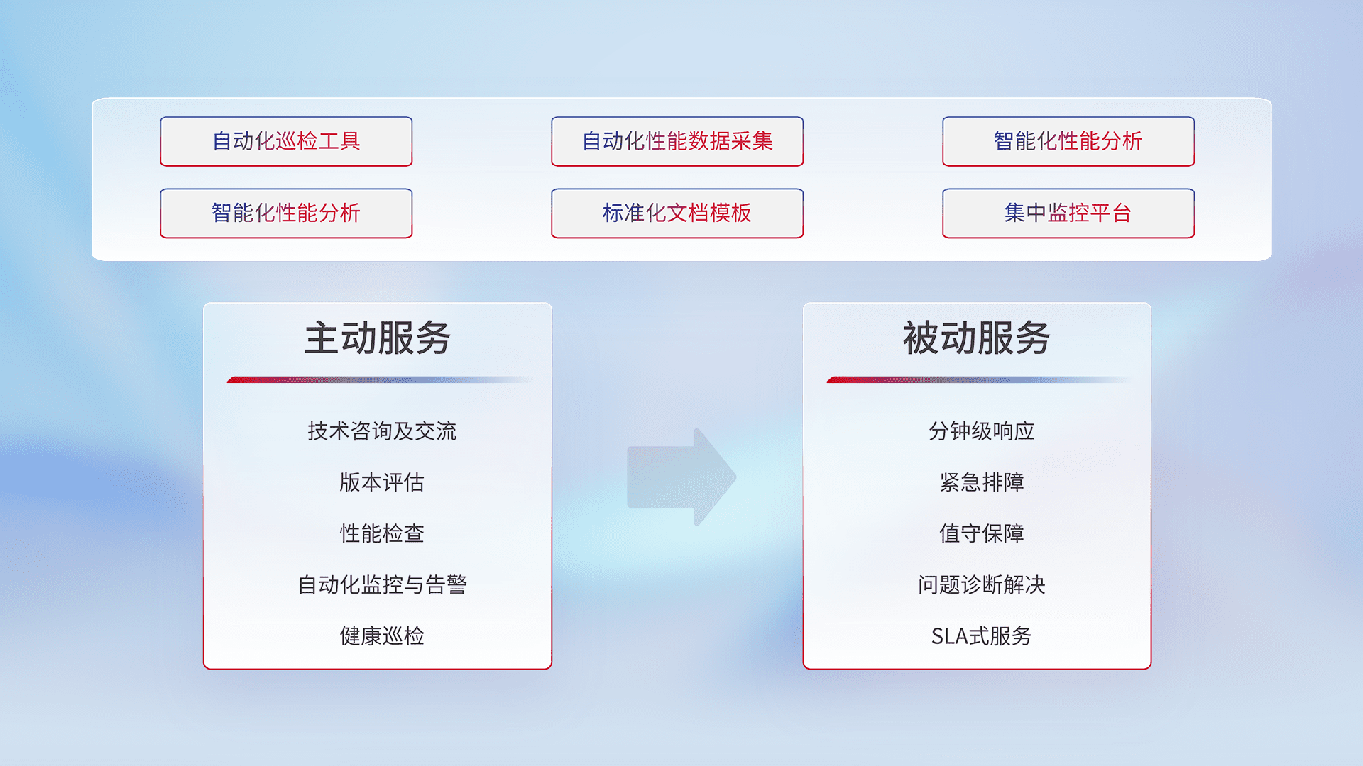 智能化工具和标准化文档,,保障服务质量,,,提供主动服务(包含技术咨询、、、版本评估、、、性能检查、、、、自动化监控与告警、、、健康巡检)和被动服务包含(分钟级响应、、、紧急排障、、值守保障、、问题诊断解决、、SLA服务)。。